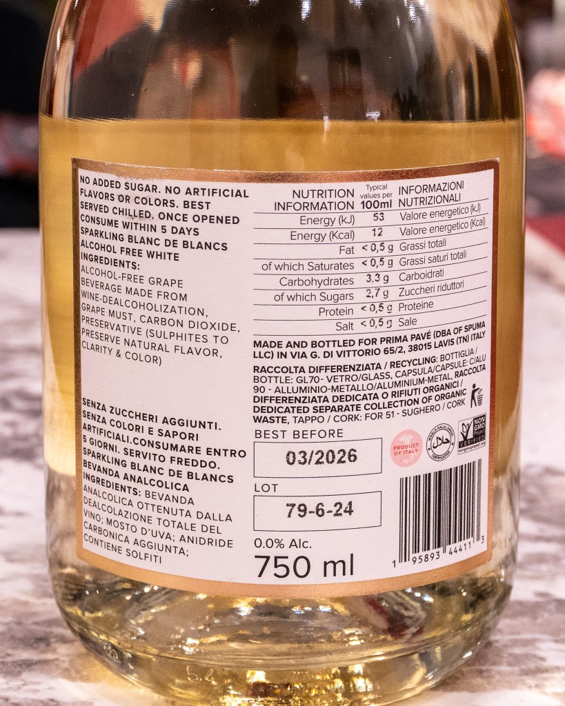 Prima Pavé was the only 0.0% abv de-alcoholized wine I found. This was a nice sparkling drink, quite floral on the nose. It’s off-dry but balanced by the carbonation.
