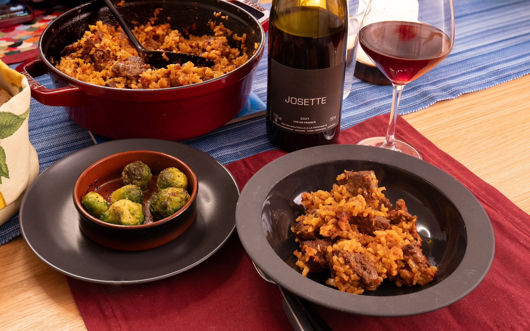 For our meal, we looked to a recipe from southwest France. Julia Child has a nice wintry recipe, Bœuf à la Catalane, consisting of a braise of beef, onions, tomatoes and rice. We served a side dish of blanched and roasted brussels sprouts. We finished with, of course, a nice piece of Roquefort cheese. You might find a recipe for Bœuf à la Catalane online or certainly use Julia Childs’ Art of French Cooking as we did.