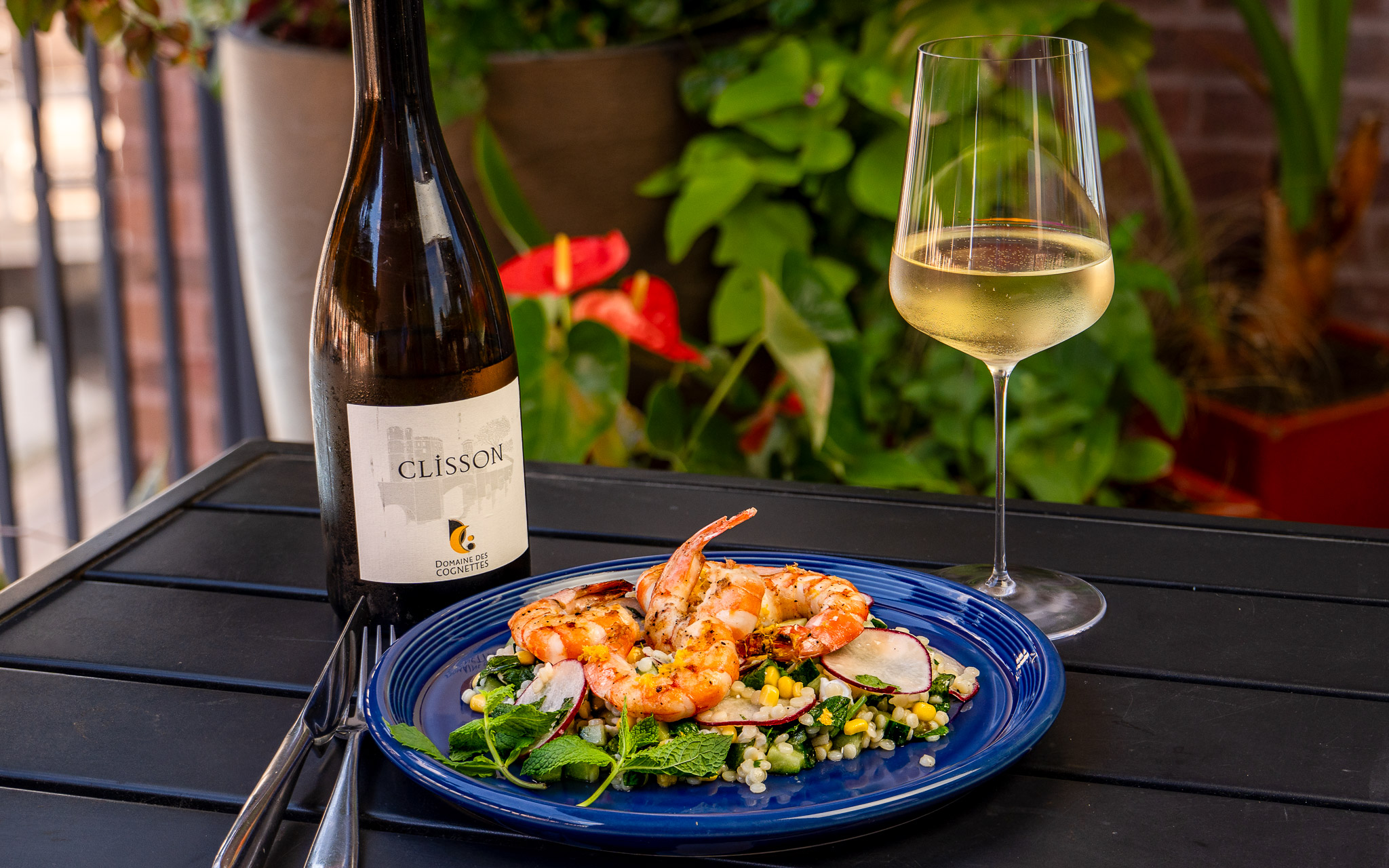 We love cool salads-as-dinner in the summer. We have our favorites, but I’m always looking for something new. Today we tried a Pearl Couscous Salad with Shrimp and Feta from the New York Times. The only cooking required was the couscous and the shrimp. The salad was cool and the shrimp were quickly sautéed and served warm on top. The extra body and texture in the Cru Communeaux Muscadet paired beautifully with the rich flavor of the shrimp while simultaneously offering refreshing acidity and freshness.