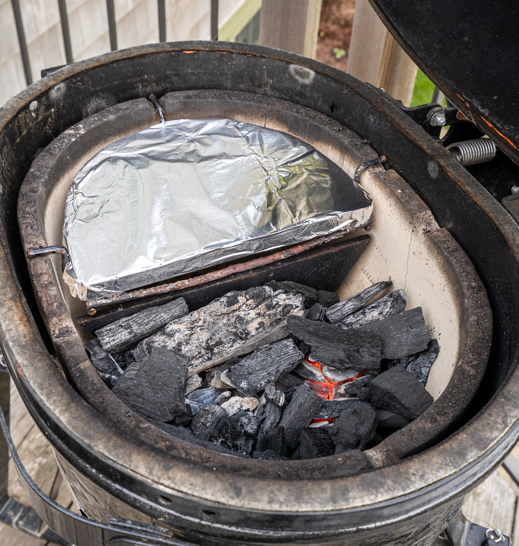 Charcoal goes on one side of the grill, ceramic diverter plate (covered with foil) sits over the empty side